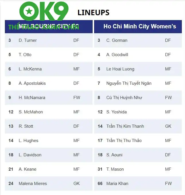 Đội hình dự kiến Nữ TP HCM vs Nữ Melbourne City
